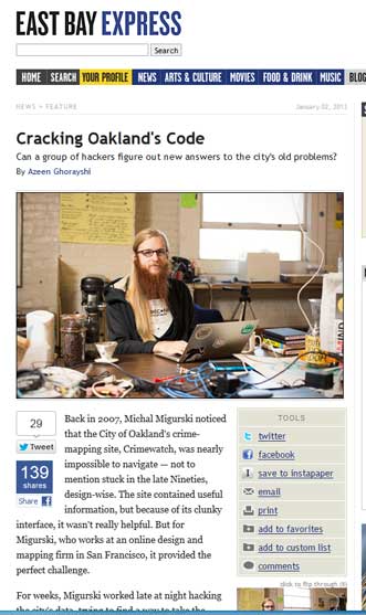 One way is by hiring someone with roots in both the Maker/techie scene and the Oakland DIY arts community. Did you know Oakland has an Online Engagement Director? We didn’t, and we are fascinated to learn about Nicole Neditch’s appointment to the position. Neditch is a programmer, was one of the co-owners of the much-loved and now lost Oakland institution Mama Buzz Cafe, co-founded The Bay Area Visual Arts Network, and helped launch Art Murmur. You can read more about her work here. Given Oakland’s uneasy history with the Anonymous/Occupy sector of the hacking community, the creation of these positive working relationships is also a testament to the good will the “Oakland Renaissance” has generated!