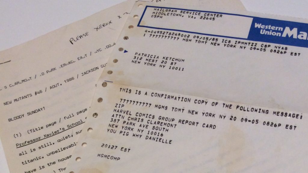 I meticulously explained to the telegraph operator over the phone how to address it to the specific letter column group for the New Mutants, “Report Card”.
