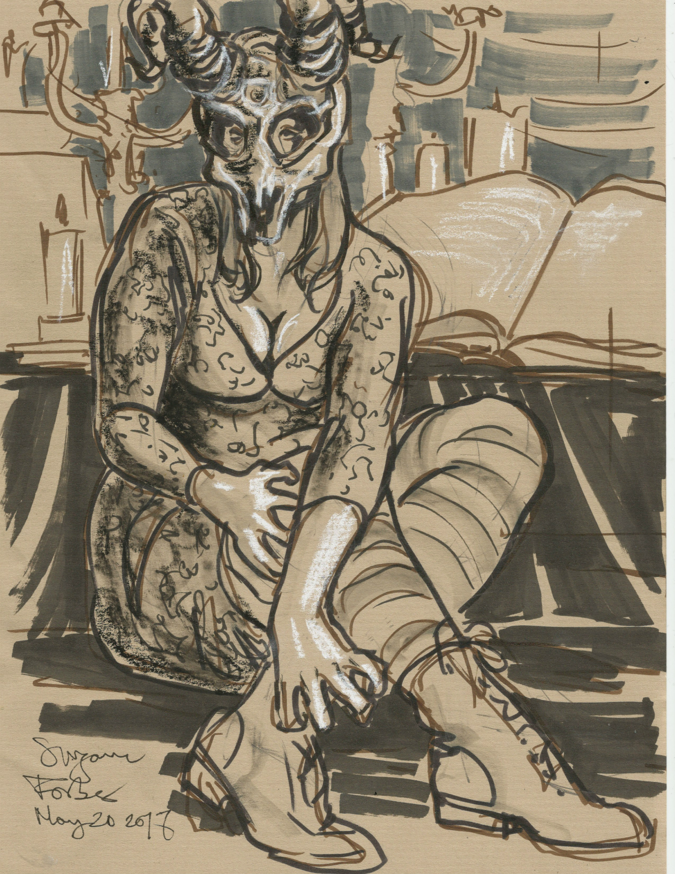 Kelsey in mask she made at Drink and Draw Berlin by Suzanne Forbes May 2017
