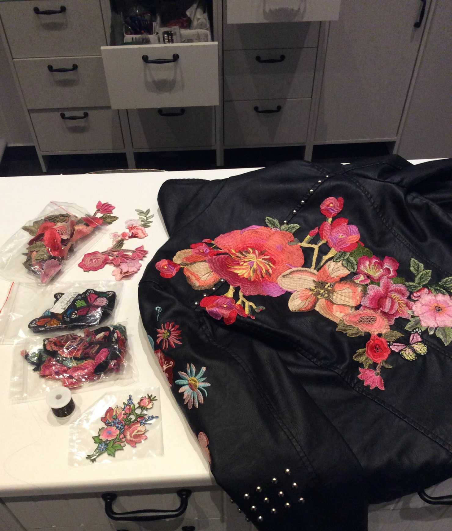 Collage embroidered floral motorcycle jacket created by Suzanne Forbes