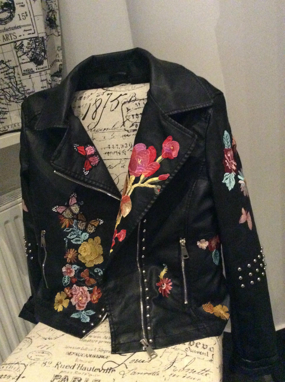 Collage embroidered floral motorcycle jacket created by Suzanne Forbes