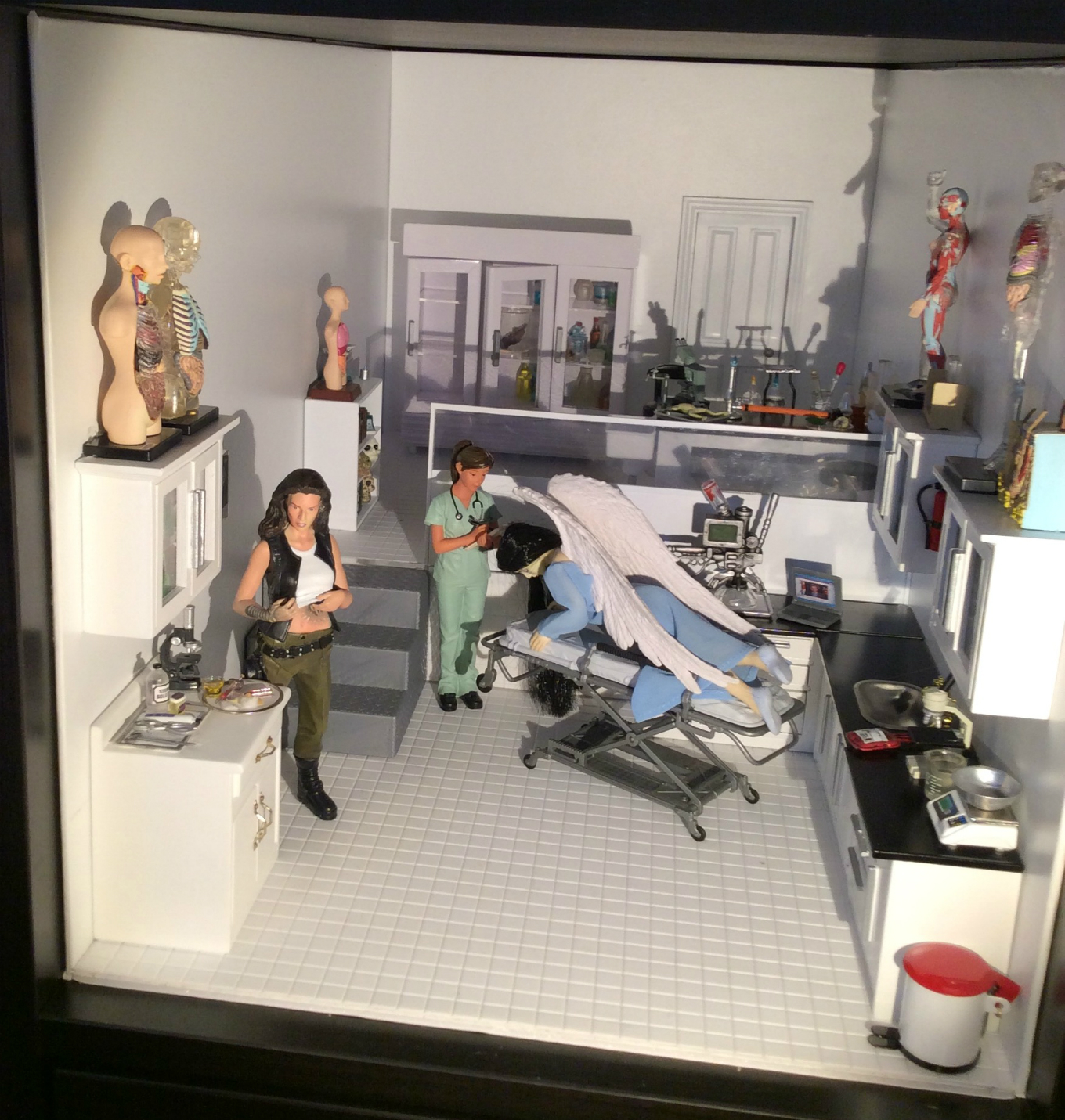 Action figure dollhouse laboratory surgery WIP by Suzanne Forbes April 2018