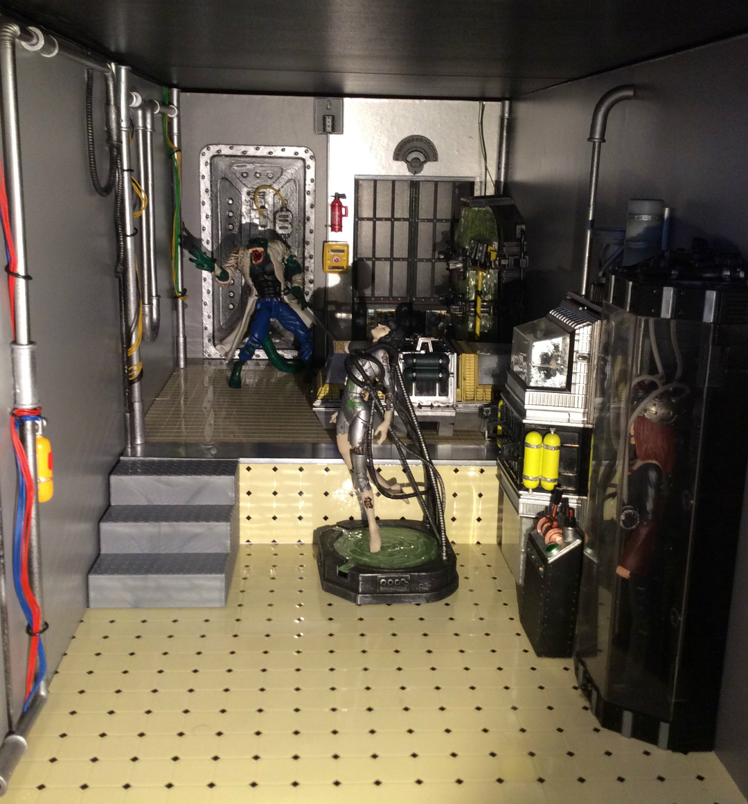 Action figure dollhouse laboratory tube room full view WIP by Suzanne Forbes April 2018