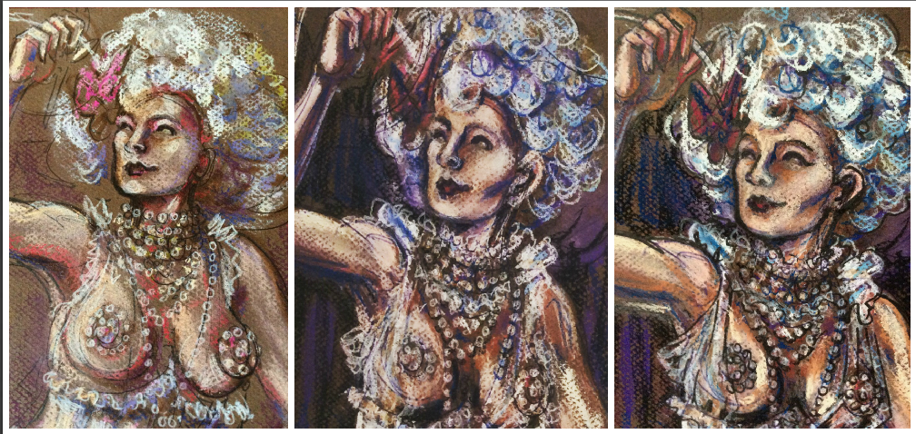 Portrait of Viva Lamore in media media and pastel work in process by Suzanne Forbes 2017 to 2018