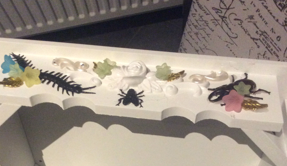 Bug Bricolage footstool wip front side March 2019 suzanne forbes artist
