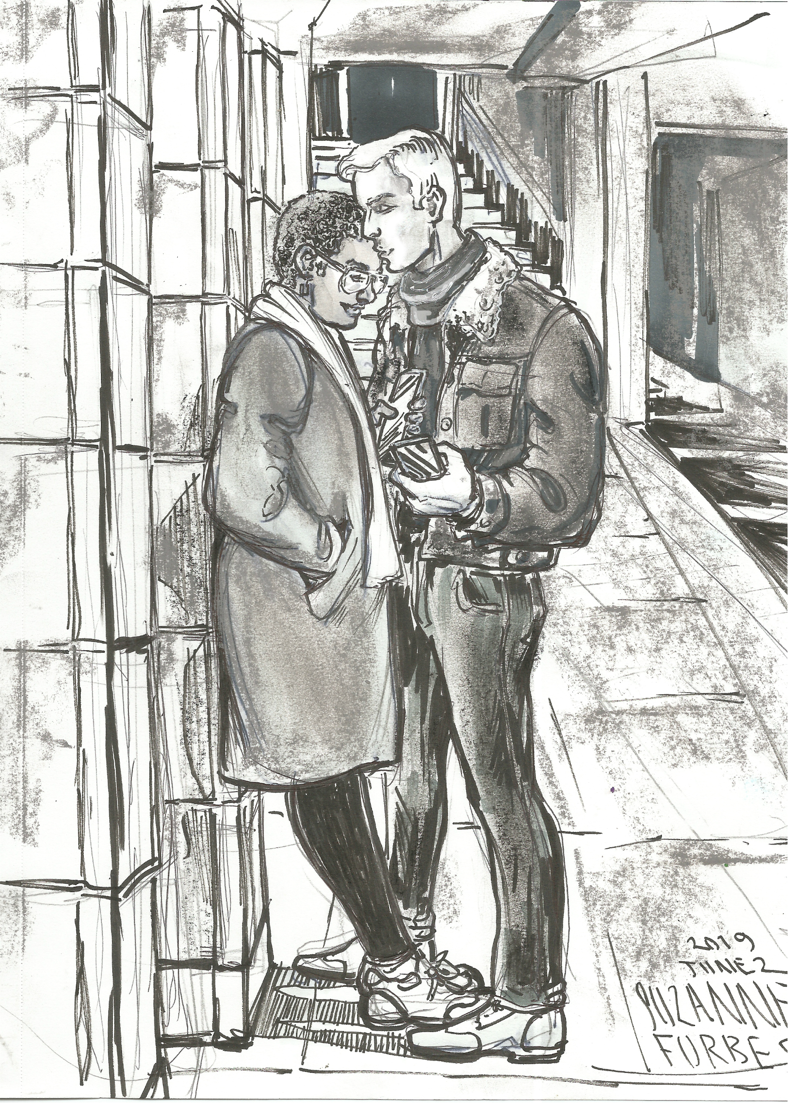 Tender couple on the platform Unterwegs June 2 2019 by Suzanne Forbes