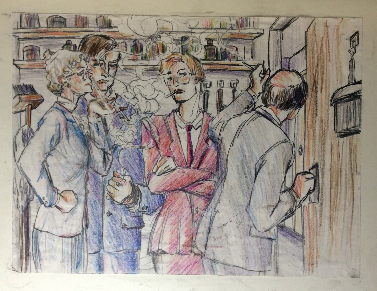 Smoker comps detail for Tom Garrettt Illustration Class Fall 1990 by Rachel Ketchum aka Suzanne Forbes