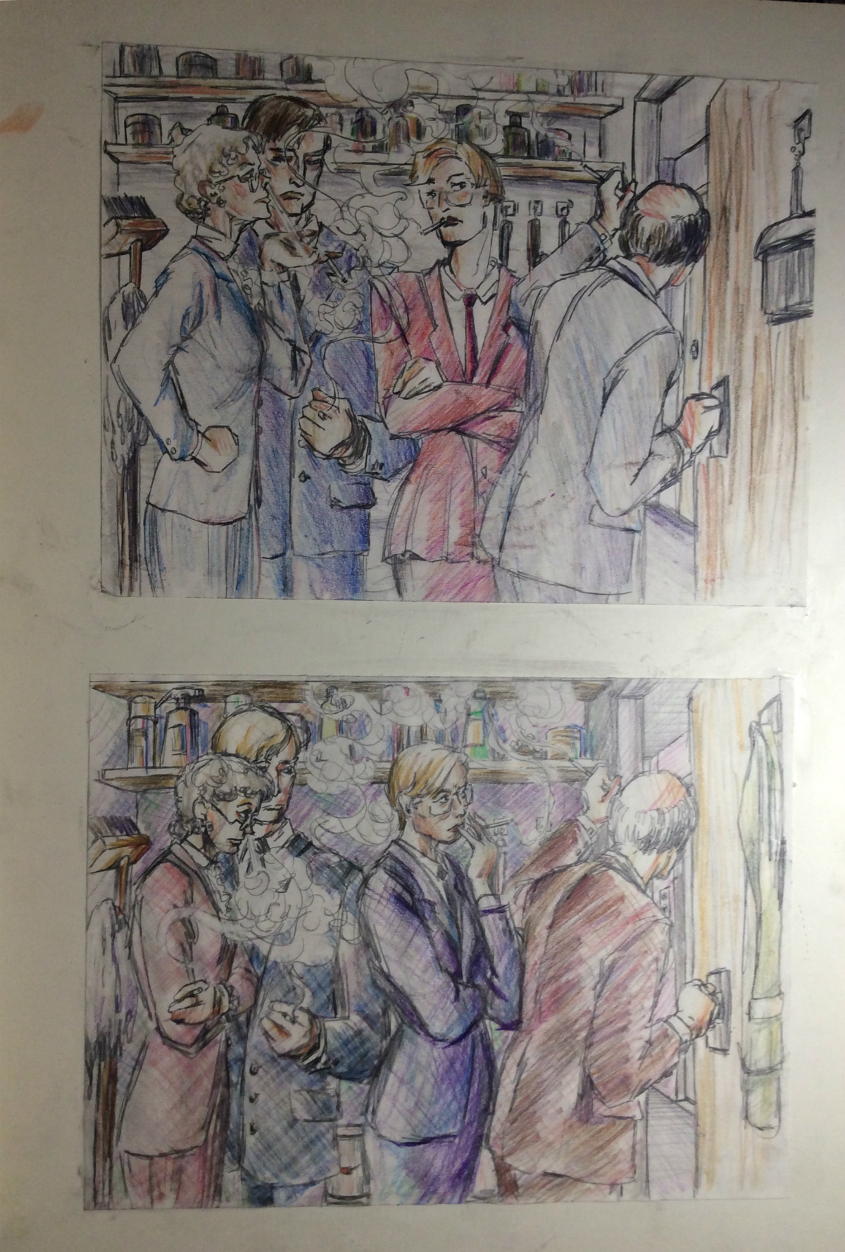 Smokers comps for Tom Garrettt Illustration Class Fall 1990 by Rachel Ketchum aka Suzanne Forbes