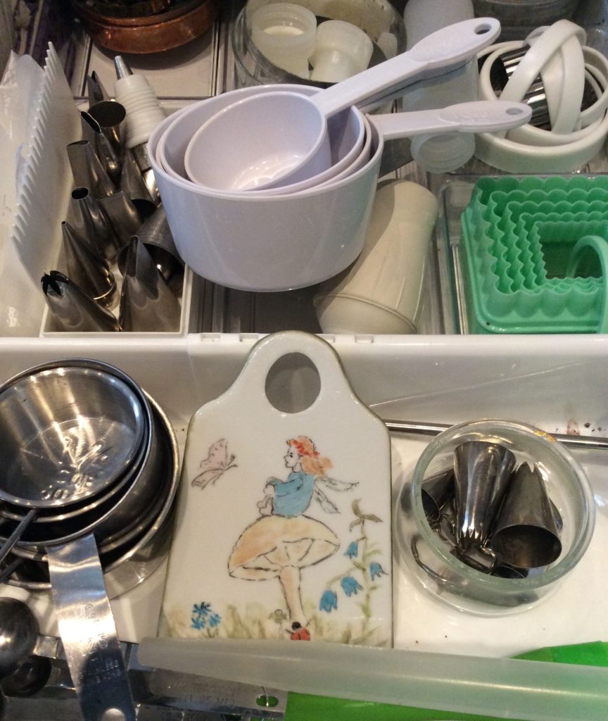 She was the first person I knew who made French buttercream; it was a huge deal, back then, and many people are still skittish about it. Don’t be – get a copy of the Cake Bible and read everything on buttercream, then only make Rose’s Honey Buttercream forever! In this drawing you can see the little hand-painted porcelain ginger grater Anita found at the thrift shop, near the stove. I still have it! I pack it so carefully every time I move, all SIXTEEN TIMES since then!