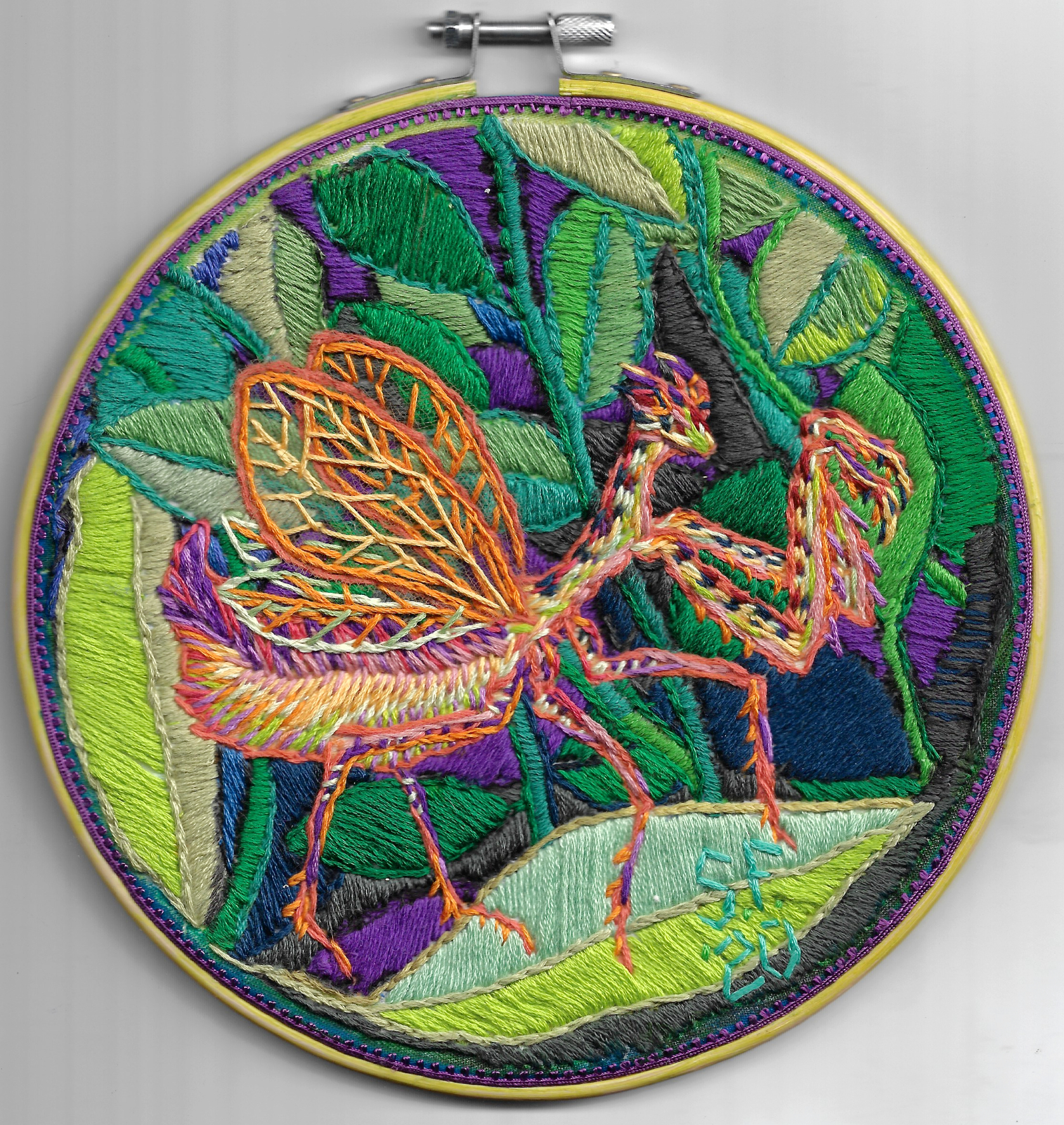 flower mantis embroidery by Suzanne Forbes September 30 2020