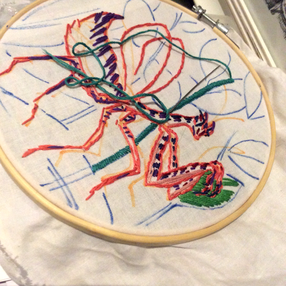 flower mantis embroidery by Suzanne Forbes work in progress 1