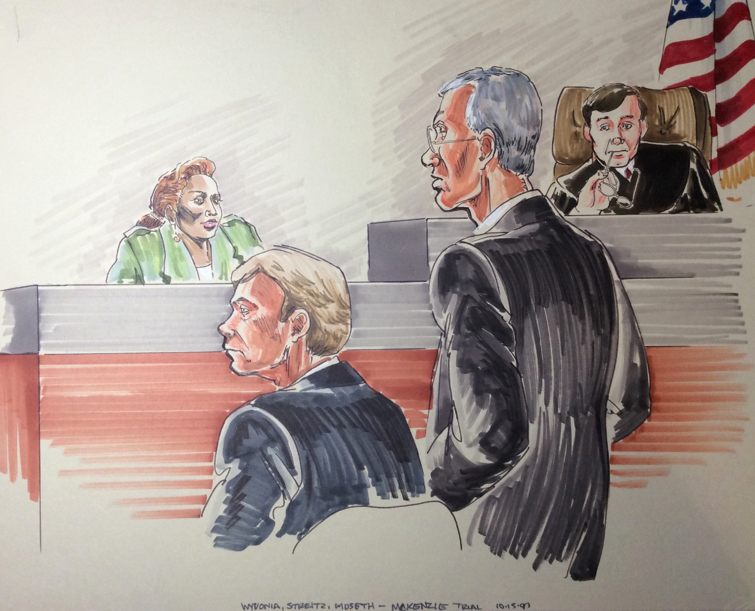 Courtroom drawing by Suzanne Forbes working as Rachel Ketchum ca 1992 McKenzie trial