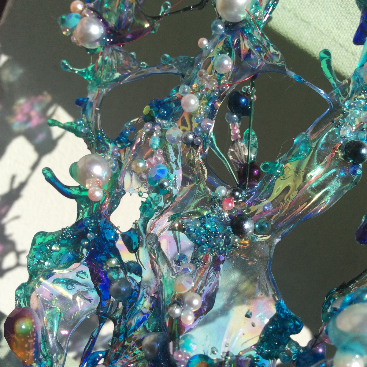 UV resin and Angelina Fantasy Film antler tentacle dendrite visor by Suzanne Forbes March 30 2021 detail