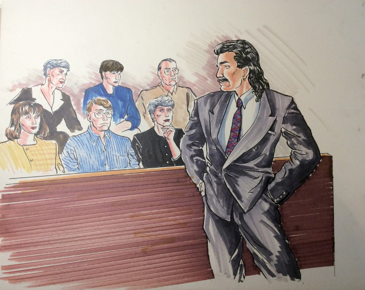 Courtroom drawing by Suzanne Forbes working as Rachel Ketchum ca 1993 defense 1