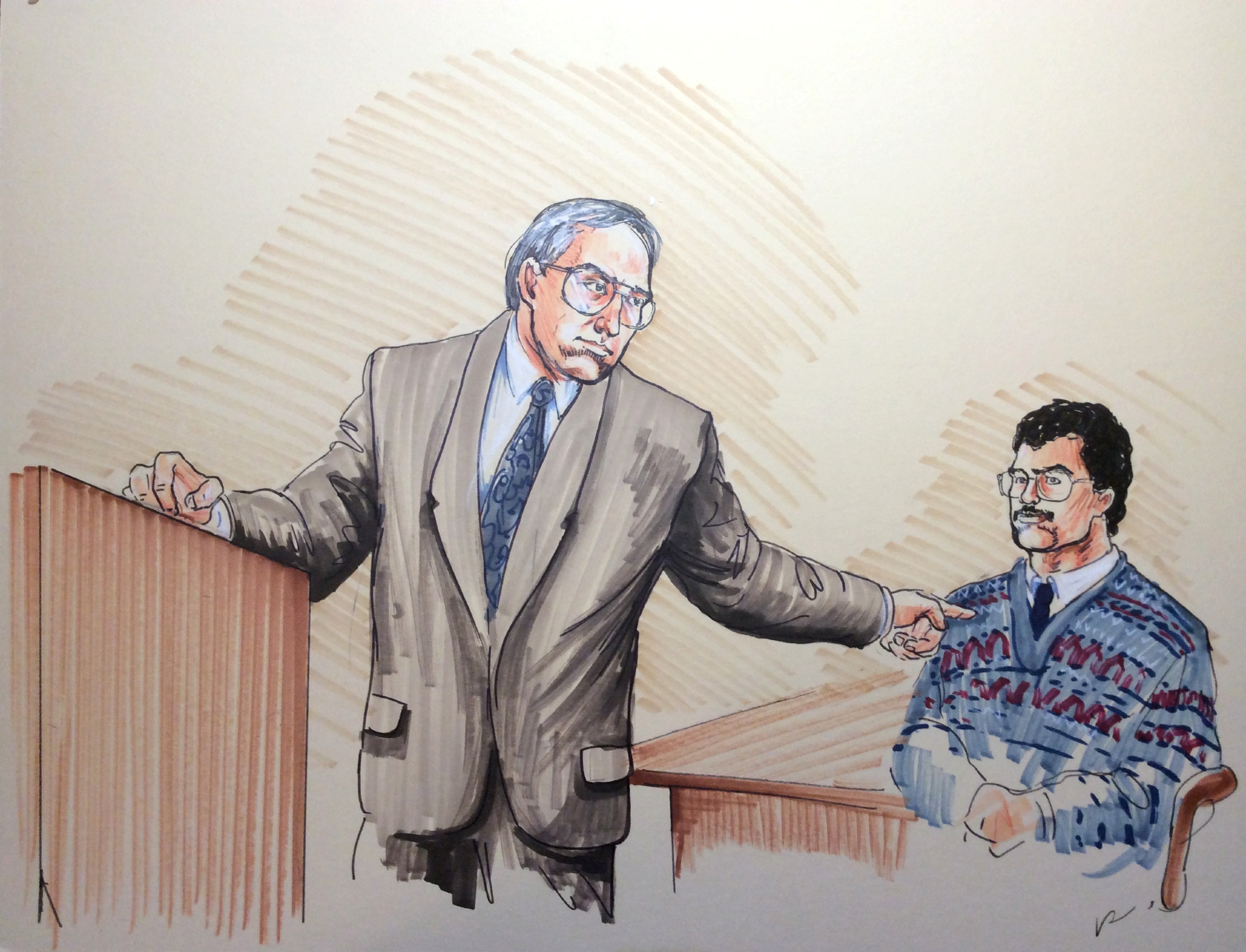 Courtroom drawing by Suzanne Forbes working as Rachel Ketchum ca 1993 prosecution and defendant