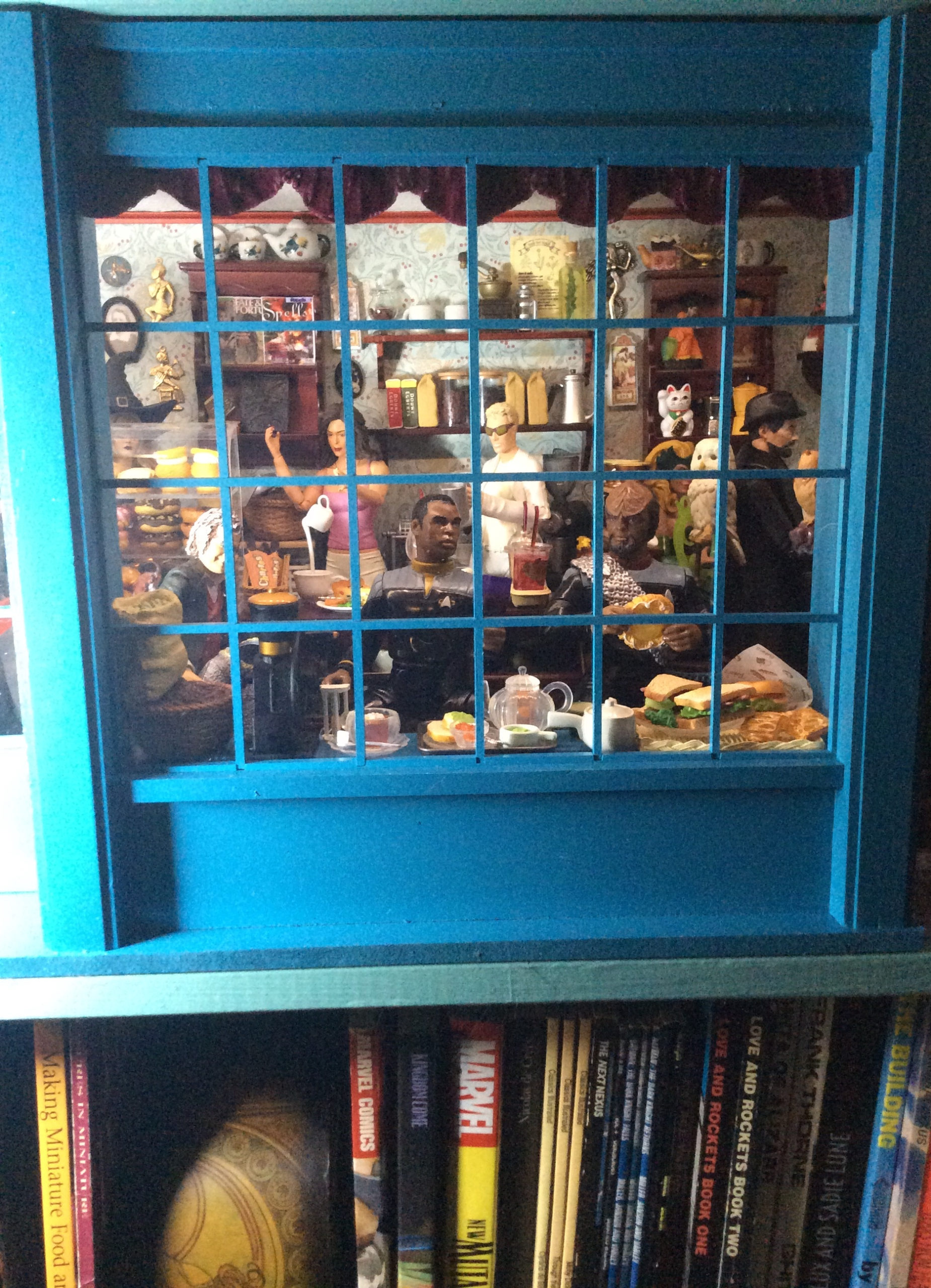 Cafe Morgana dollhouse miniature coffee roastery window and shelf by Suzanne Forbes June 2021