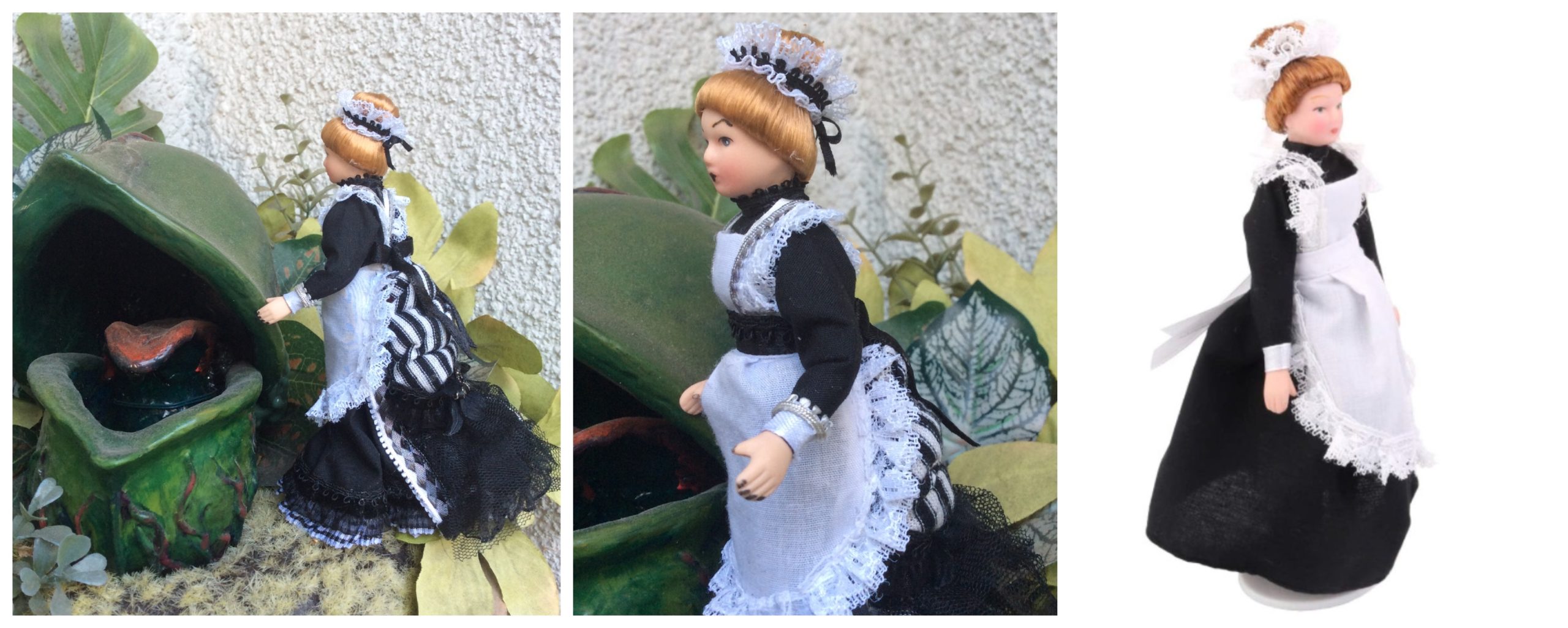 six inch scale bustle dress dollhouse maid custom by Suzanne Forbes August 2021 outside (1)