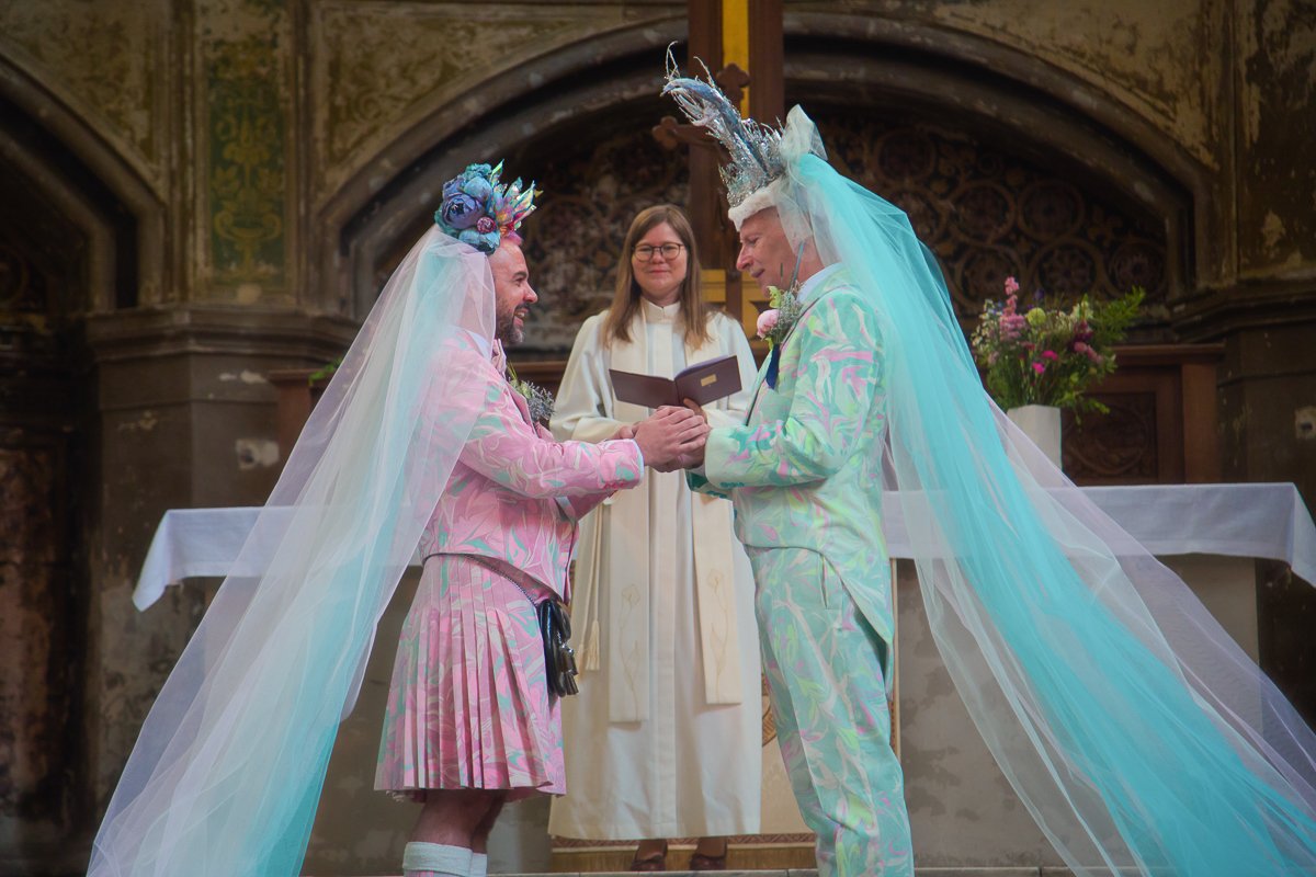 Wedding ceremony of Gieza and Tomi wearing crowns by Suzanne Forbes event photography by Jenkins Photography May 2022