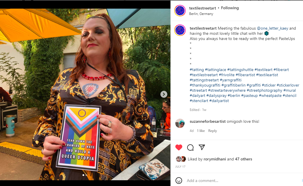 Kaey with Tatting lace and paste up art by Textile Street Art at Queerberg Presents Whoriental Festival July 22 2022