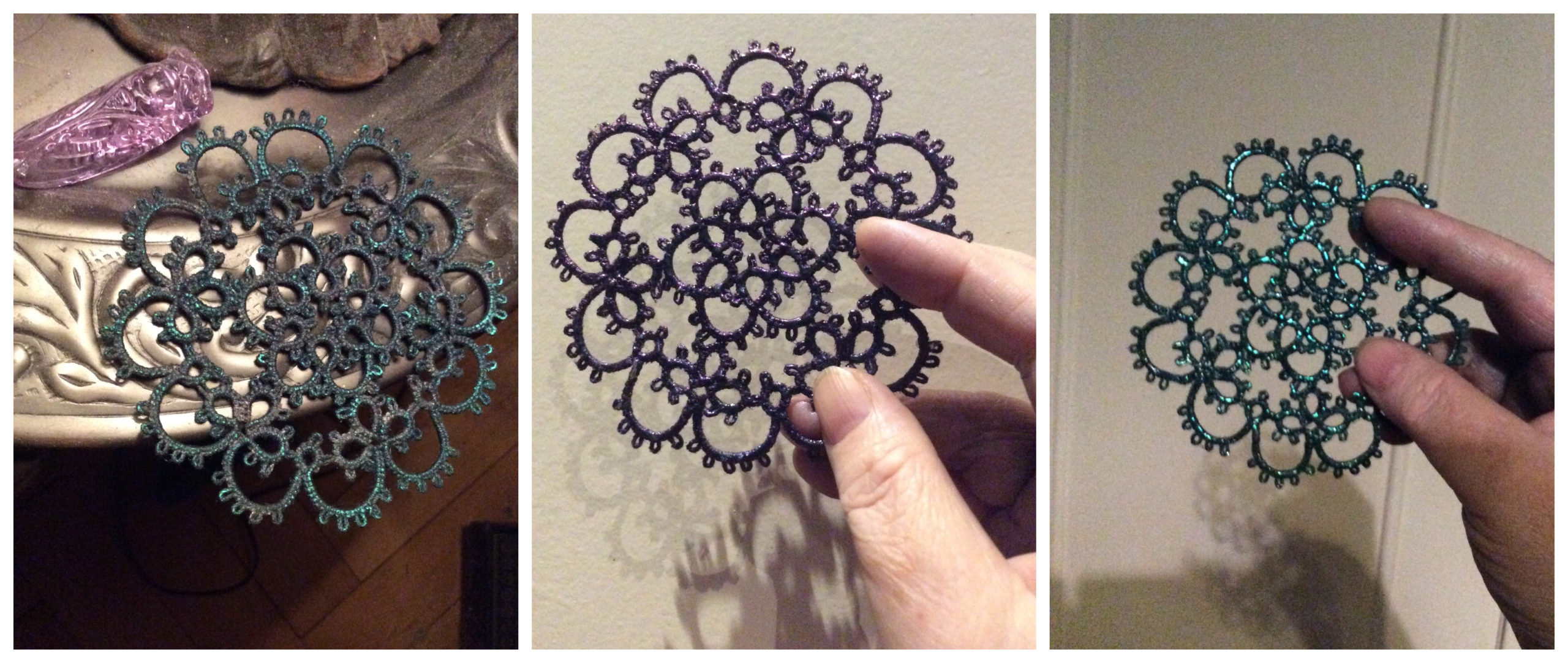 Tatting lace by Textile Street Art July 22 2022 with duochrome powder