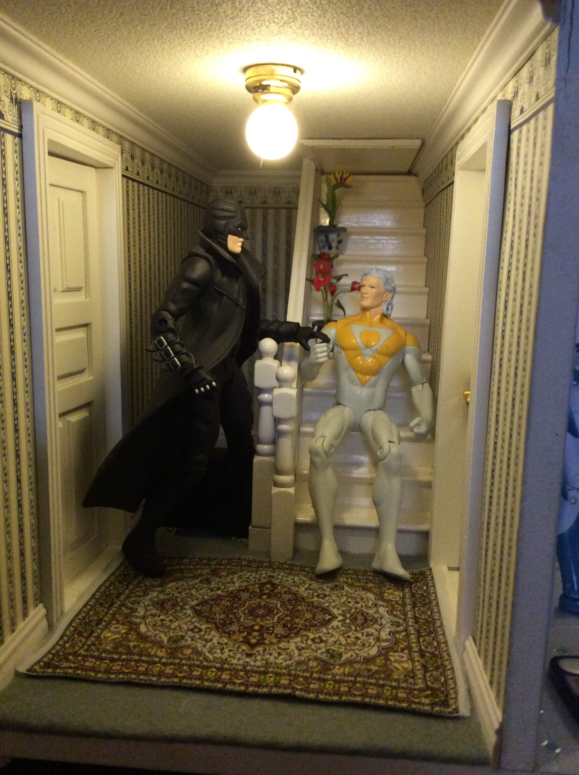 Stairs to Ororos attic X Men dollhouse with Apollo and Midnighter by Suzanne Forbes July 2022