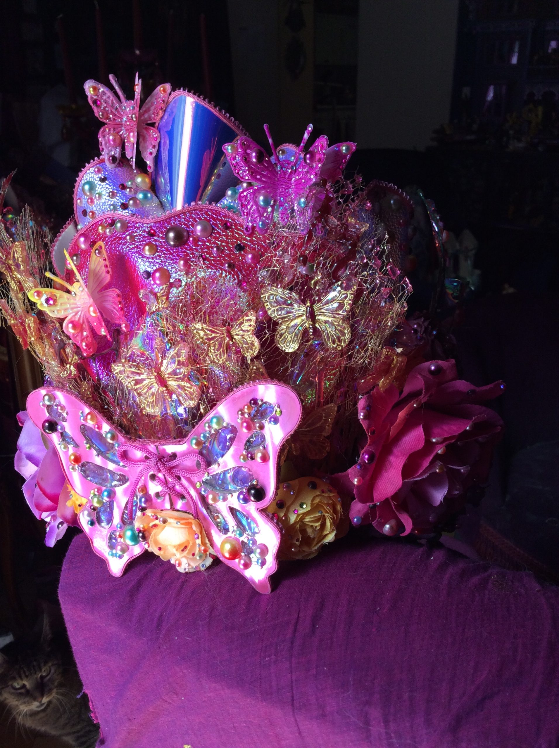 Butterfly Headpiece of Holographic vinyl UV resin and Angelina Fantasy Film for Miss Lola Rose by Suzanne Forbes August 2022