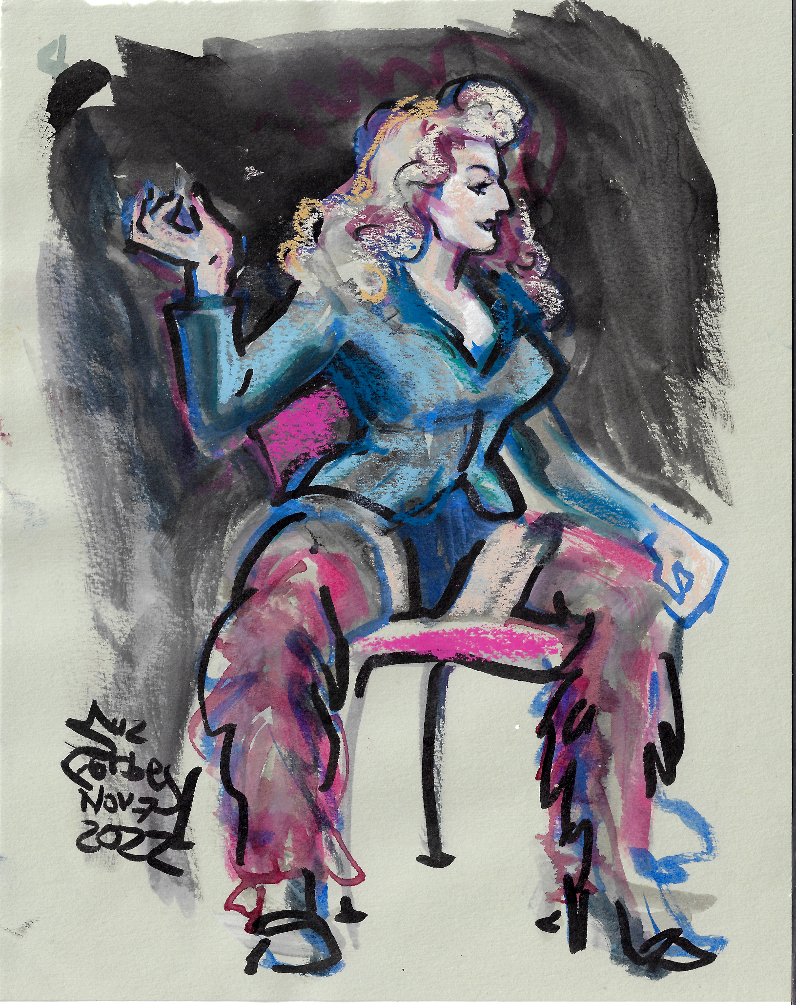 Lolita Vavoom, a curvy white woman with blonde and purple hair, poses in a sexy way, drawn by Suzanne Forbes Nov 2022