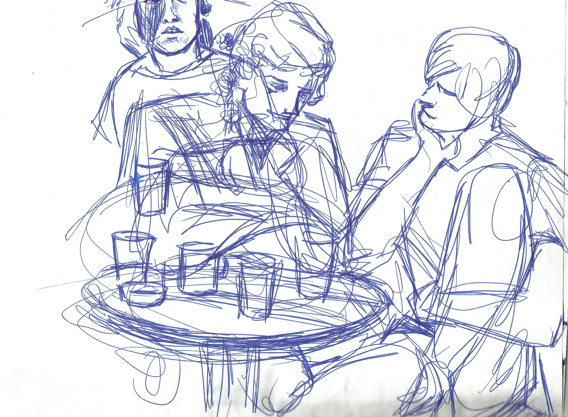 Paul and Tom at table drawing by Rachel Ketchum aka Suzanne Forbes June 1990