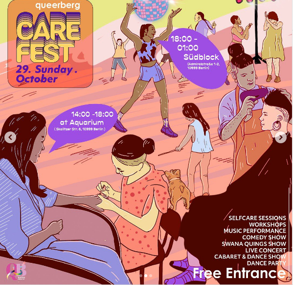 Queerberg Presents Care Fest flyer with artwork by Krishan Rajapakshe