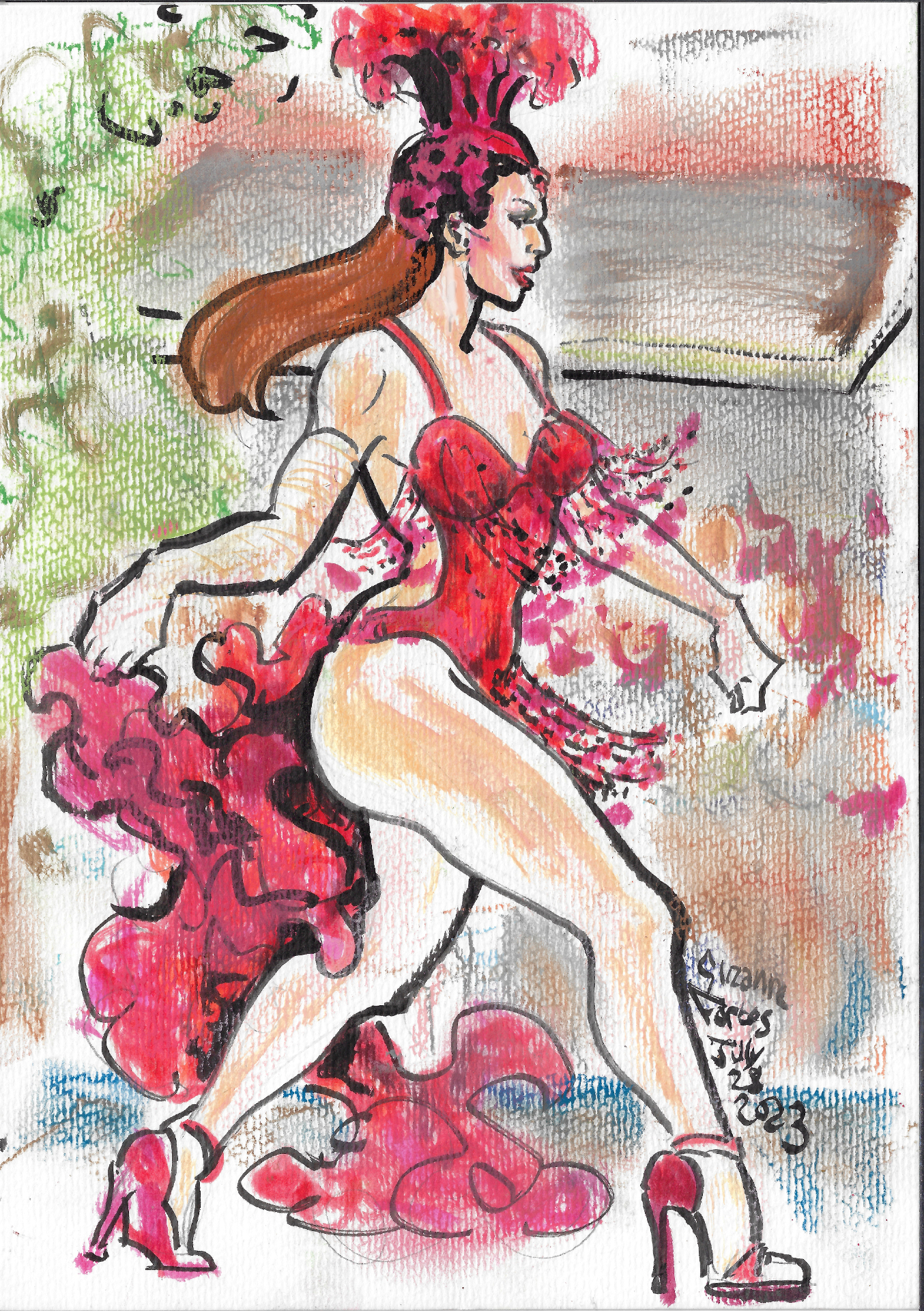 ChiquiLove, a slim light skinned femme dressed in red burlesque costume, dances onstage, at Qweer Spring Market by Suzanne Forbes July 28 2023