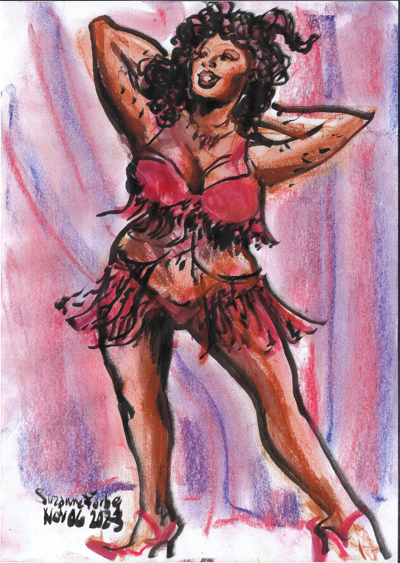 Mixed media drawing by Suzanne Forbes of Coco Deville performing her Devil’s Samba routine. She is a curvaceous Black woman in spangled red Burlesque attire.