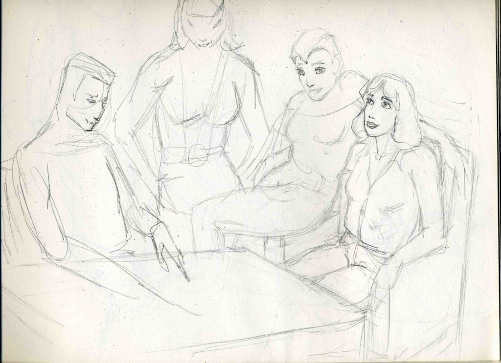 I also drew the girls as I used to draw them when I drew Rahne/Dani slash (is it slash if it was the clearly expressed subtext??) in the 80s, but in the clothes from the movie.