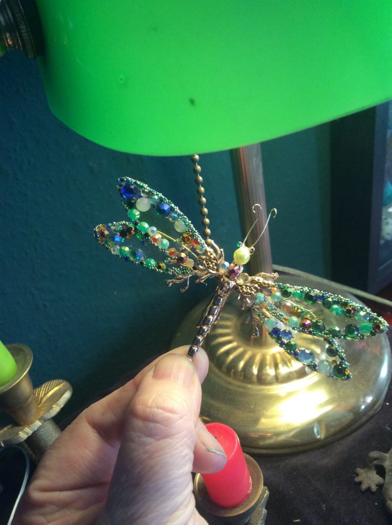I used gold wire to stabilize its acetate wings and then jeweled and microbeaded the hell out of them. Please ignore my grimy nails – it’s charcoal, not dirt!