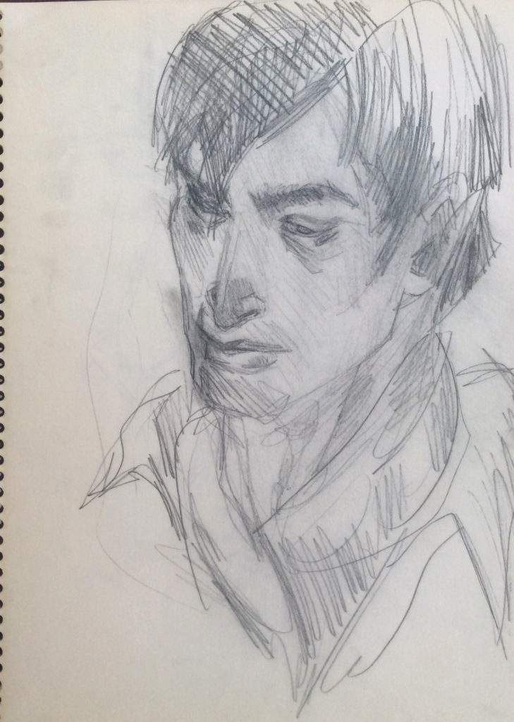 I believe this scrawl of Pablo’s face and the notes around it represent the first time I ever tried to look at someone and draw their portrait. I had drawn life models, at the Art Students League as a child, but for the first time I was trying to draw a person. I wanted to capture his beauty.