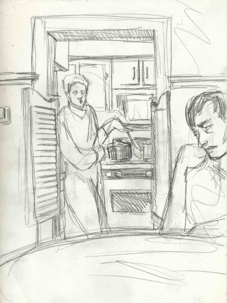 Just a single bed and a hotplate. I made this wash drawing of us in that little room in sobriety. By the late 80s we were talking a lot about going to treatment just to get away from the hell of being a junky for a month.
